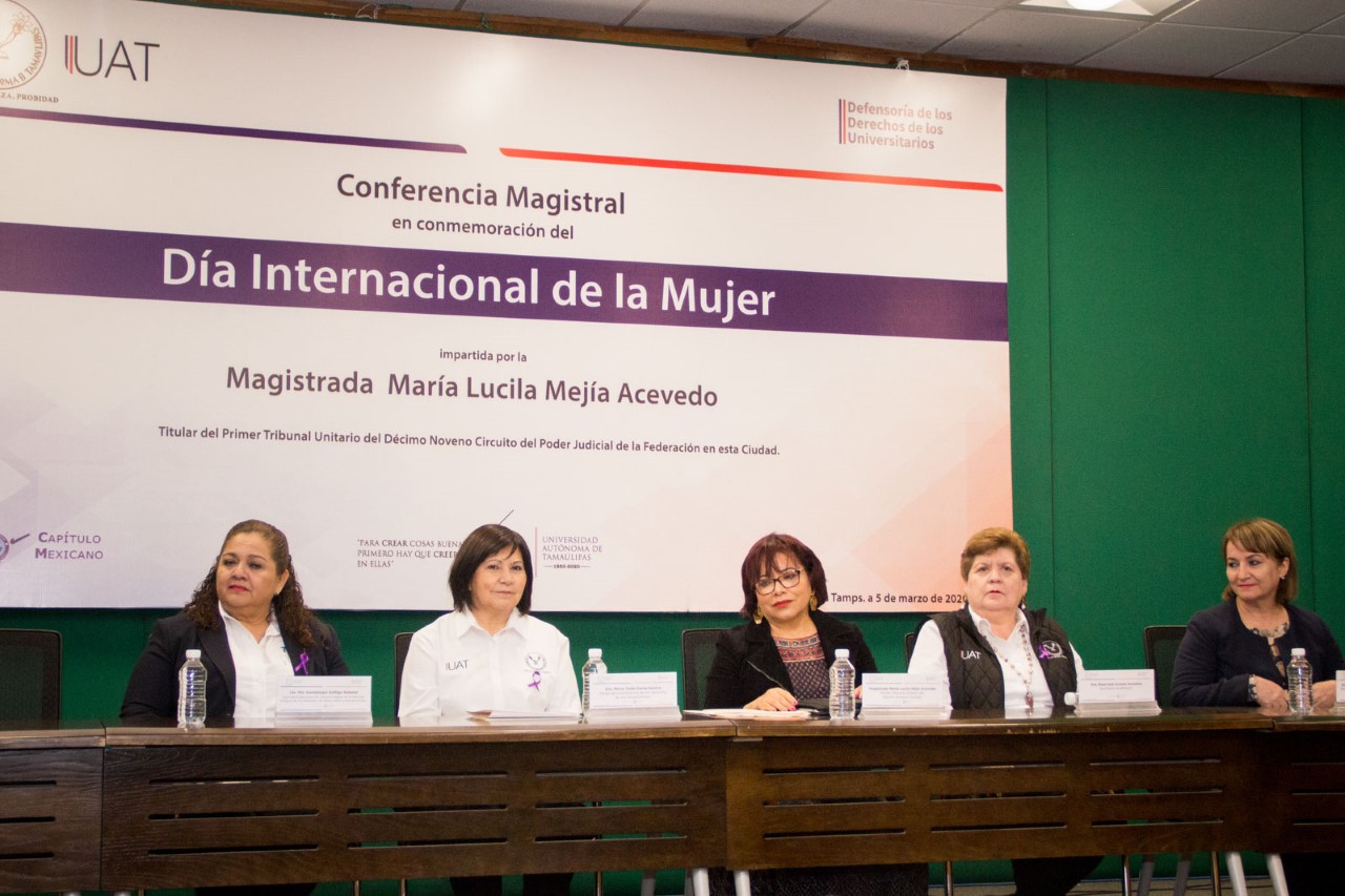 Cd. Victoria, Tamaulipas.- La Universidad Autónoma de Tamaulipas (UAT) a través de la Defensoría de los Derechos de los Universitarios, llevó a cabo la Conferencia Magistral en Conmemoración al Día Internacional de la Mujer, impartida por la Magistrada María Lucila Mejía Acevedo, Titular del Primer Tribunal Unitario del Décimo Noveno Circuito del Poder Judicial de la Federación en Ciudad Victoria.