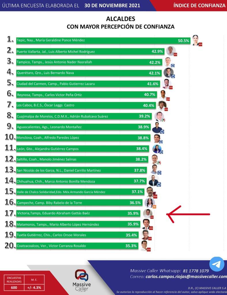 Cd. Victoria, Tamaulipas.- El victorense Eduardo Gattás Báez ya se encuentra entre los primeros alcaldes que gozan de mayor confianza entre la ciudadanía, en México.