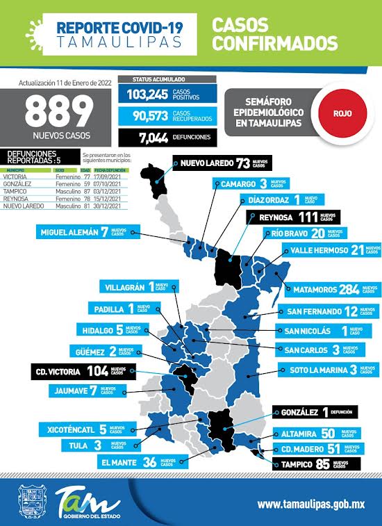 Los municipios de Matamoros (284 casos), Reynosa (111) y Ciudad Victoria (104) hicieron el uno, dos, tres en el número de contagios registrados en Tamaulipas este martes