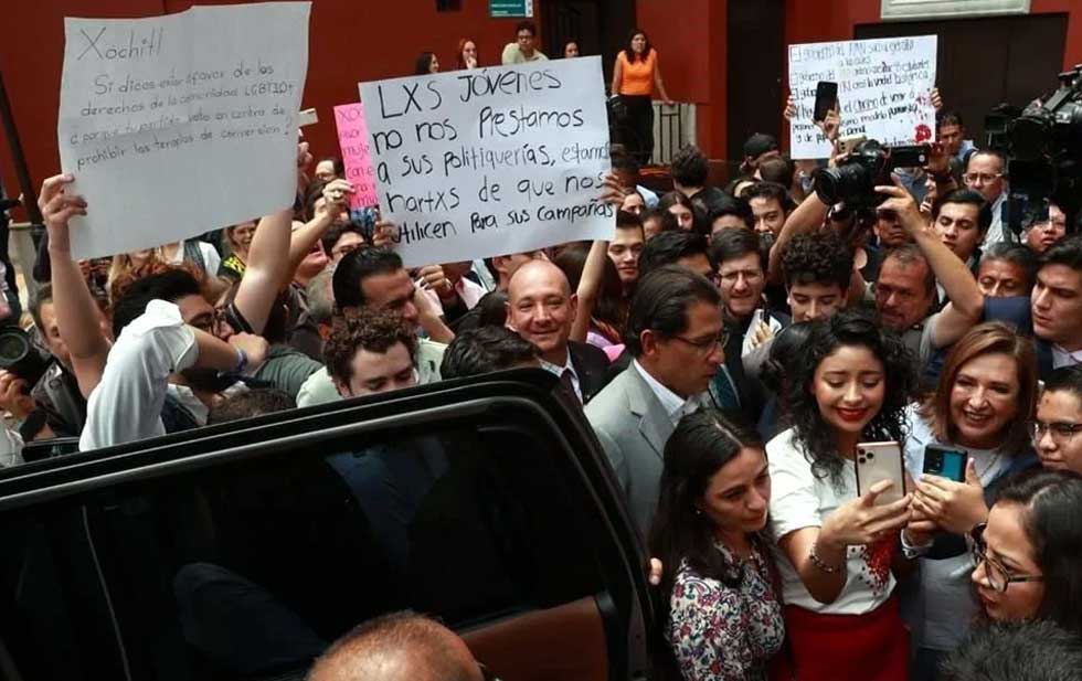 Después de concluir su participación, entre los estudiantes que se encontraban afuera del auditorio, cuatro de ellos portaron pancartas con frases como “El PAN sacó al Ejército a las calles. El PRD ordenó asesinar a 43 estudiantes. El PRI creó la verdad histórica”. Los alumnos afirmaron que “gente del PAN” les pidió de manera insistente que guardaran las cartulinas, mientras otros estudiantes gritaron porras de “presidenta, presidenta”, al momento que Gálvez pasó junto a los jóvenes que se manifestaron. (Néstor Jiménez/La Jornada).