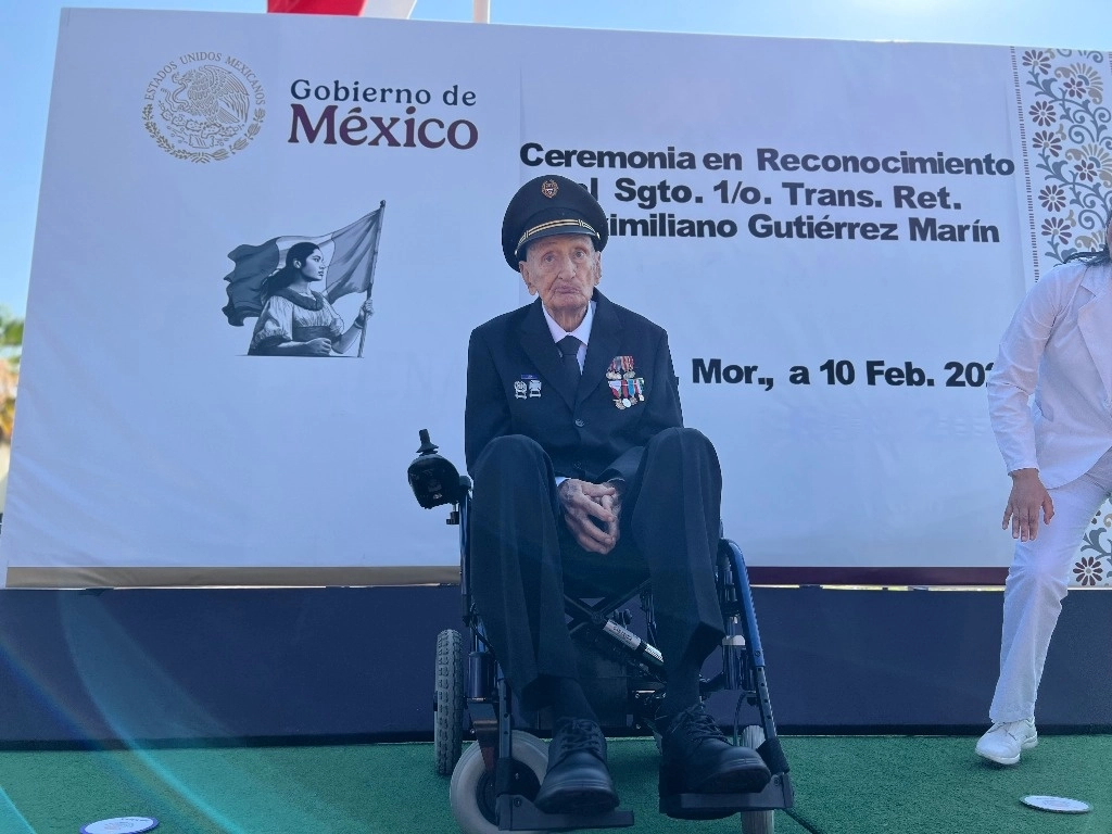 “Es para mí un honor dirigir estas palabras a nombre del ciudadano, general, Secretario de la Defensa Nacional, para brindar un reconocimiento al sargento primero de transmisiones, Maximiliano Gutiérrez Marín, veterano de la segunda guerra mundial, quien integró la Fuerza Aérea Expedicionaria Mexicana, unidad militar, que representó dignamente a México en este conflicto armado”, dijo Morán Gutiérrez.