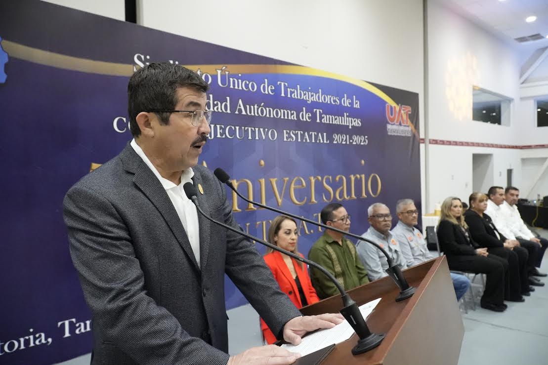 En su mensaje, destacó que, a más de cinco décadas, esta organización sindical ha sido parte esencial del crecimiento, la estabilidad y la fortaleza de la Universidad, subrayando que este encuentro no solo es una celebración, sino un reconocimiento al esfuerzo constante que hace posible que la UAT siga siendo un orgullo para todo el estado de Tamaulipas.