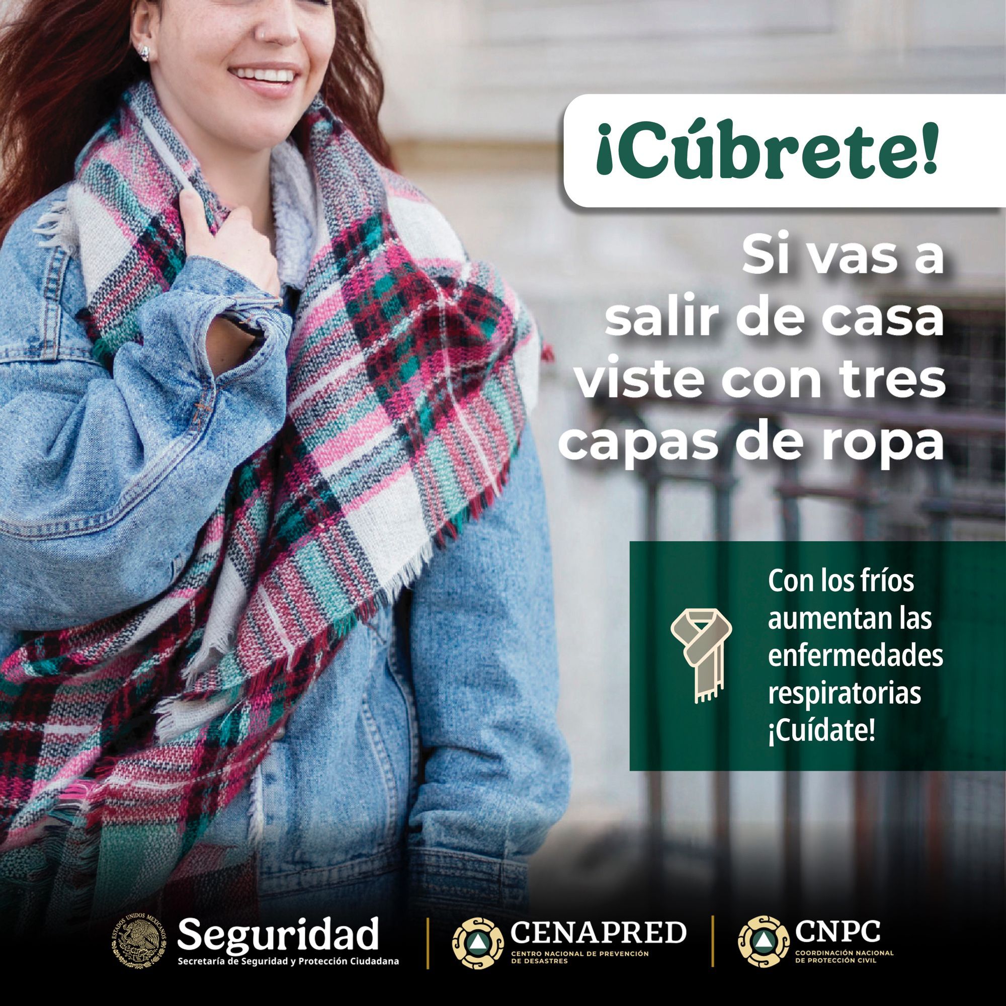 Ante esta previsión, se exhorta a la población a mantener el uso de ropa abrigadora y evitar cambios bruscos de temperatura que puedan comprometer la salud respiratoria; extremar precauciones ante las rachas de viento de componente norte, que alcanzarán velocidades de entre 70 y 90 km/h en el Istmo y Golfo de Tehuantepec, y de 40 a 60 km/h en las costas de Yucatán y Quintana Roo; y asegurar objetos que puedan ser proyectados por el viento y conducir con velocidad moderada en zonas de lluvia o bancos de niebla.